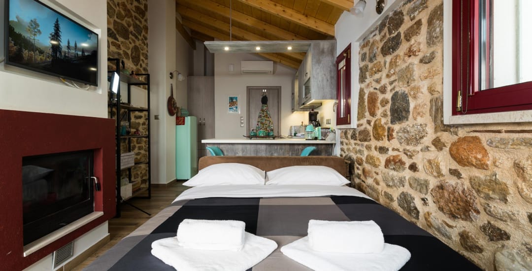 This small luxury flat is set in a quaint street and the walking distance is 30 meters from high street of the town. Orianna apartment is completely renovated in 2018 and tastefully furnished, with attention to details, earthy tones with natural stone. It has interior designed with bright spaces, modern comforts and amenities. The total space of the flat is composed of two spacious areas. The first one has a king bed and It includes high speed Wi-Fi internet and a flat screen TV for relax time. Behind the bed, there is the dining area and the the full equipped kitchen with all electricity devices, which makes you feel like home. The private bathroom features a walk-in shower complimented by bath-care products. There is also parking area on the high street.